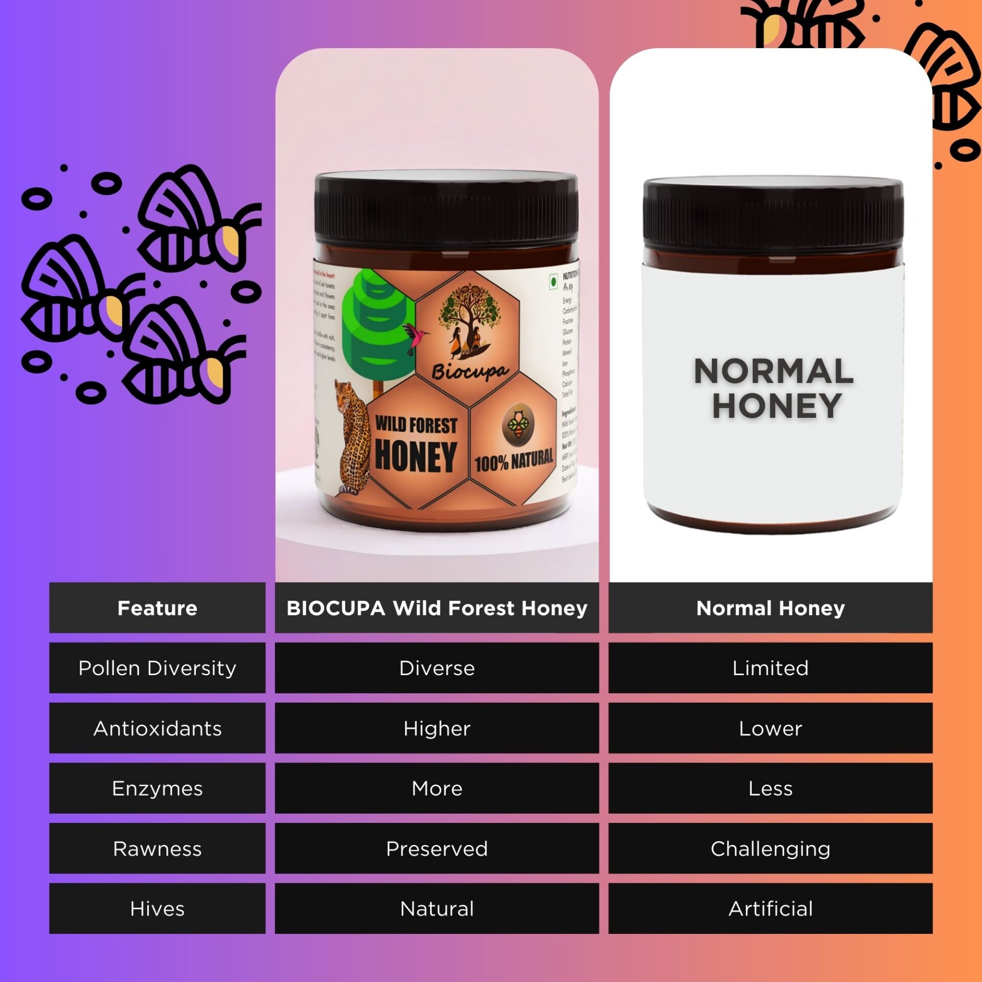 1) It is harvested from wild hives, pure & flavorful.